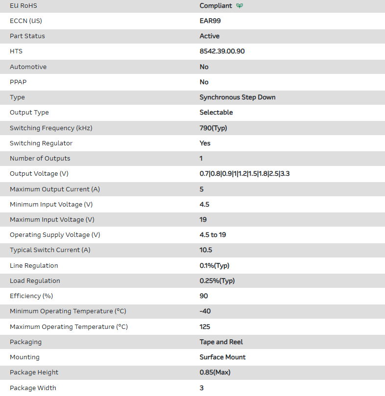 Conv DC-DC 4.5V to 19V Synchronous Step Down Single-Out 0.7V/0.8V/0.9V/1V/1.2V/1.5V/1.8V/2.5V/3.3V 5A 20-Pin QFN EP T/R