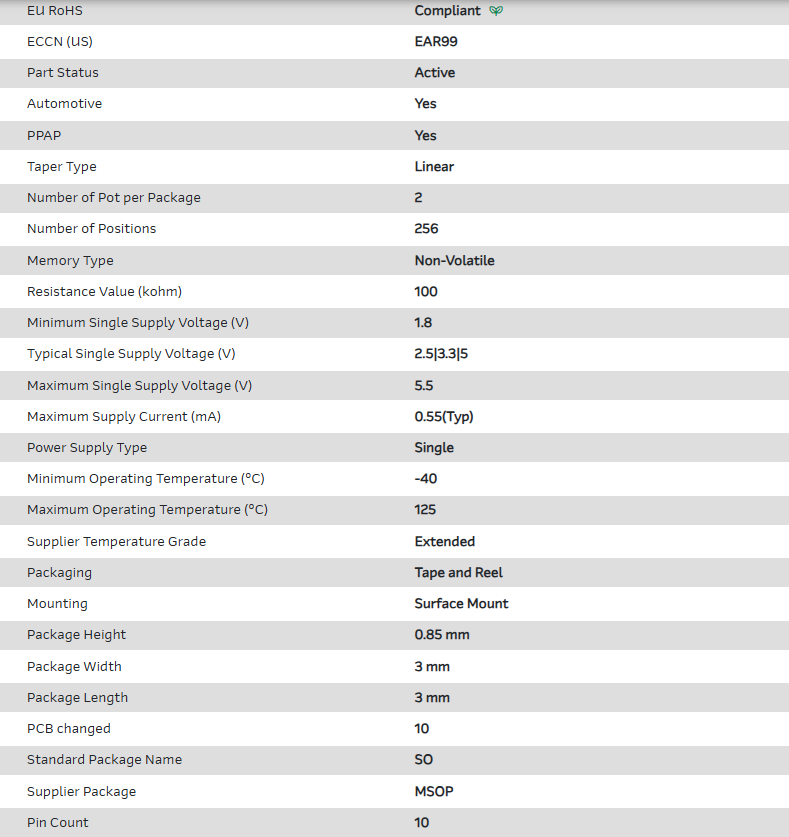 Digital Potentiometer 100kOhm 256POS Non-Volatile Linear Automotive 10-Pin MSOP T/R