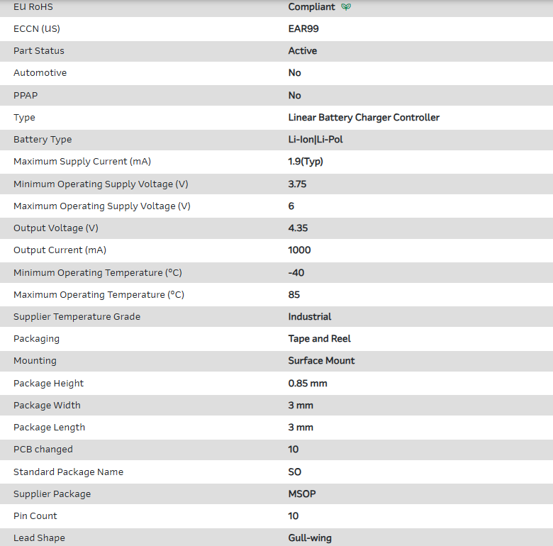 Linear Battery Charger Controller Li-Ion/Li-Pol 1000mA 4.35V 10-Pin MSOP T/R