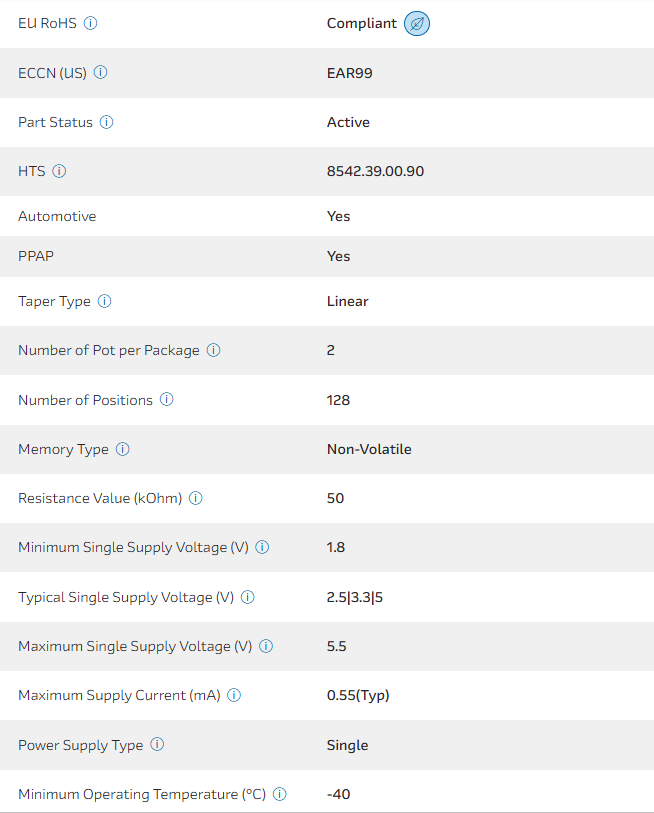 Digital Potentiometer 50kOhm 128POS Non-Volatile Linear Automotive 10-Pin MSOP Tube