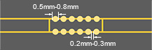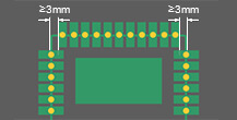 The distance between castellated hole and board corner should be larger than 4mm. Recommended diameter of stamp hole is 0.5mm-0.8mm; Recommended distance between the two stamp holes is 0.2-0.3mm |